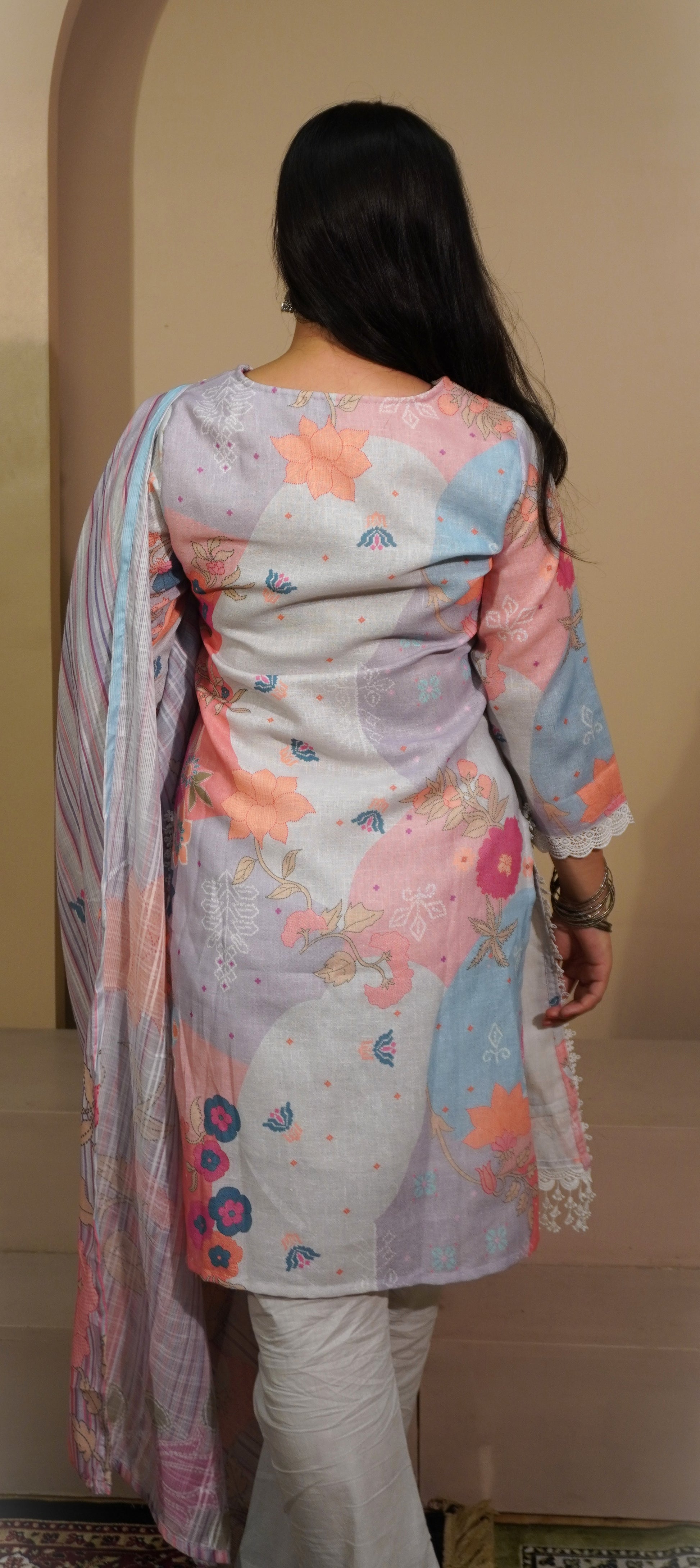 Step into elegance with this pastel floral suit set, a perfect blend of softness and sophistication. The kurta features a delicate mix of lilac, blush, coral, and sky-blue hues with blooming floral patterns that bring out a refreshing charm.